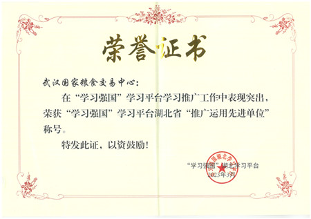 日前,省委宣传部、省委讲师团联合“学习强国”湖北学习平台组织评选湖北省推广运用先进单位,湖北粮网经层层推选,被评为“推广运用先进单位”,成为省直单位22个先进单位之一。